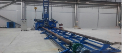 主要由基礎軌道系統、螺旋盤管主機、螺旋管立支撐料架、螺旋管水平出料料架、液壓系統、電控系統、模具等部分組成。